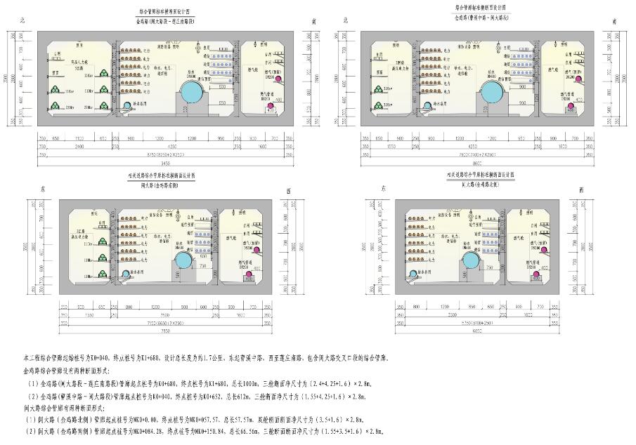 :①斷面凈尺寸為(2.4十4.25十1.6)×2.8M,艙內管線有:給水管(管徑DN800)、通信管(16孔,含電信管、交通電纜及有線電視電纜)、電力管(30孔)、2回22KV高壓電力、3回110KV高壓電力及管廊自用電力管,并預留—定空間。②斷面凈尺寸為(1.55十4.25十1.6)×2.8M,艙內管線有:給水管(管徑DN800)、通信管(16孔,含電信管、交通電纜及有線電視電纜)、電力管(30孔)、2回22KV高壓電力、3回110KV高壓電力及管廊自用電力管,并預留—定空間。工程總投資10500萬元。